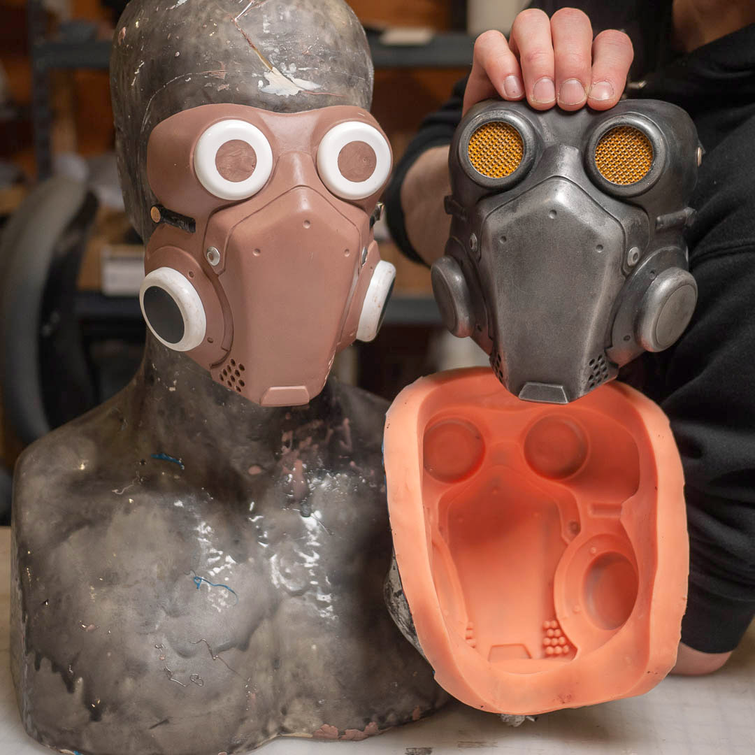 This cyberpunk mask is an original creation, inspired by the video game Cyberpunk 2077. The mask was originally sculpted in Monster Clay with a few additional found parts added in. A brush-on silicone mold was made of the clay sculpture, allowing copies to be cast in rigid or flexible materials. The masks shown here are cast in a semi-rigid urethane resin, allowing the mask to conform to the wearer’s head. Paints are acrylic.